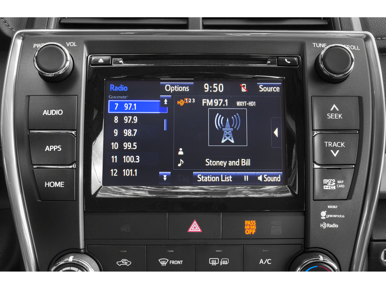 - Radio: Entune Audio Plus -inc: Entune multimedia bundle, 6.1" touch-screen display, AM/FM CD player, MP3/WMA playback capability, 6 speakers, auxiliary audio jack, USB 2.0 port w/iPod connectivity and control, advanced voice recognition, hands-free phone capability, phone book access and music streaming via Bluetooth® wireless technology, SiriusXM radio w/90-day complimentary trial, HD Radio and HD traffic and weather in major metro areas